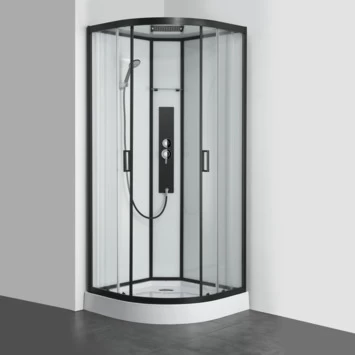 Geniet van een warme douche na een vermoeiende dag. Stap gemakkelijk in de doucheruimte met de instap op de hoek en de antislip-voorziening in de douchebak. De schuifdeuren open je door deze met de handgrepen te schuiven. Je hoeft daardoor in (de indeling van) je badkamer geen rekening te houden met een openzwaaiende deur. De wanden van de douche zijn van doorzichtig veiligheidsglas, zodat je optimale lichtinval hebt vanuit je badkamer. De achterzijde van de cabine is van wit glas gemaakt. Het geheel is afgewerkt in strakke glanzend zwarte aluminium profielen. Dat staat mooi in jouw modern of minimalistisch interieur!